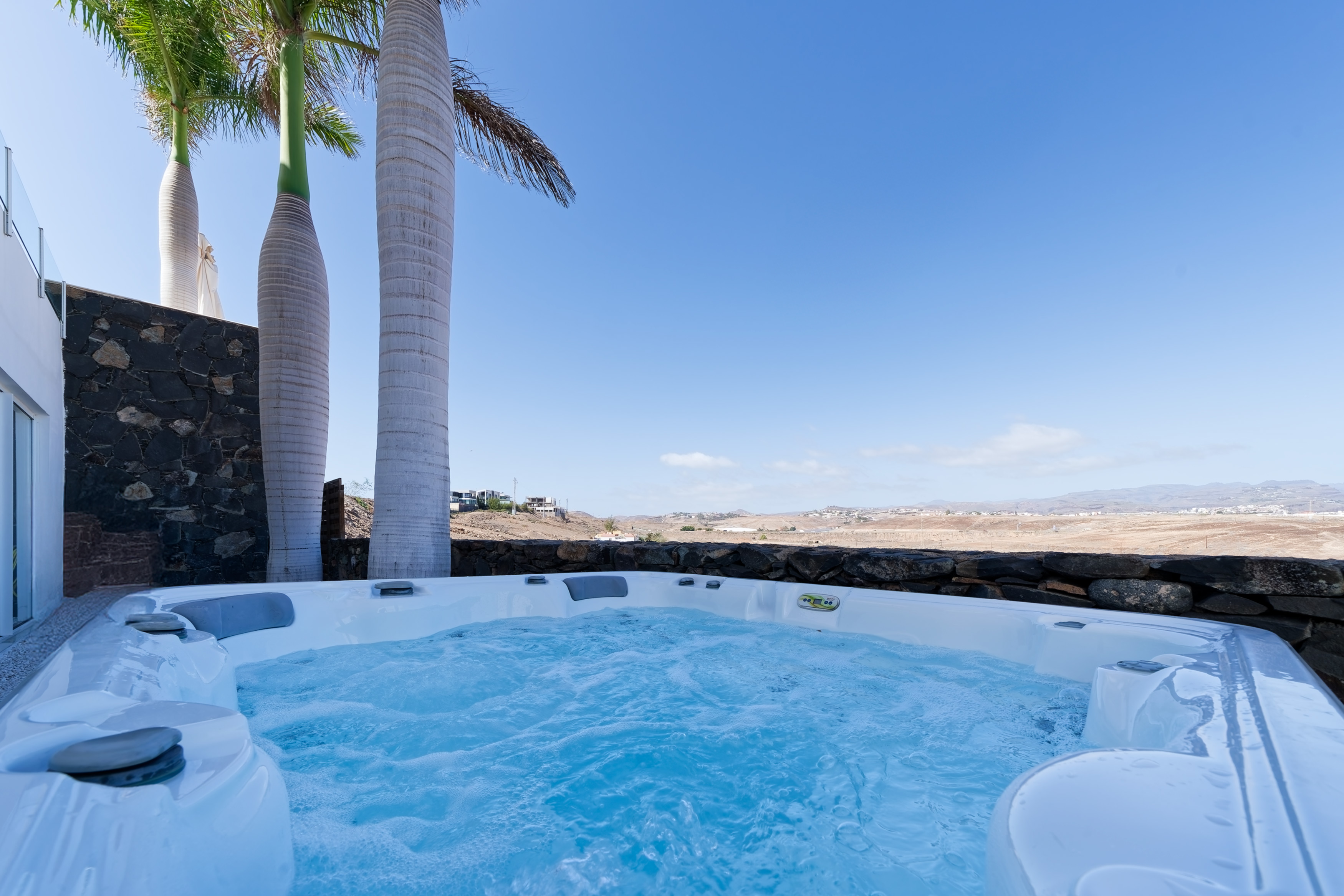 Su zona exterior destaca por la piscina privada, el jacuzzi y una amplia terraza ideal para descansar o disfrutar de comidas al aire libre.