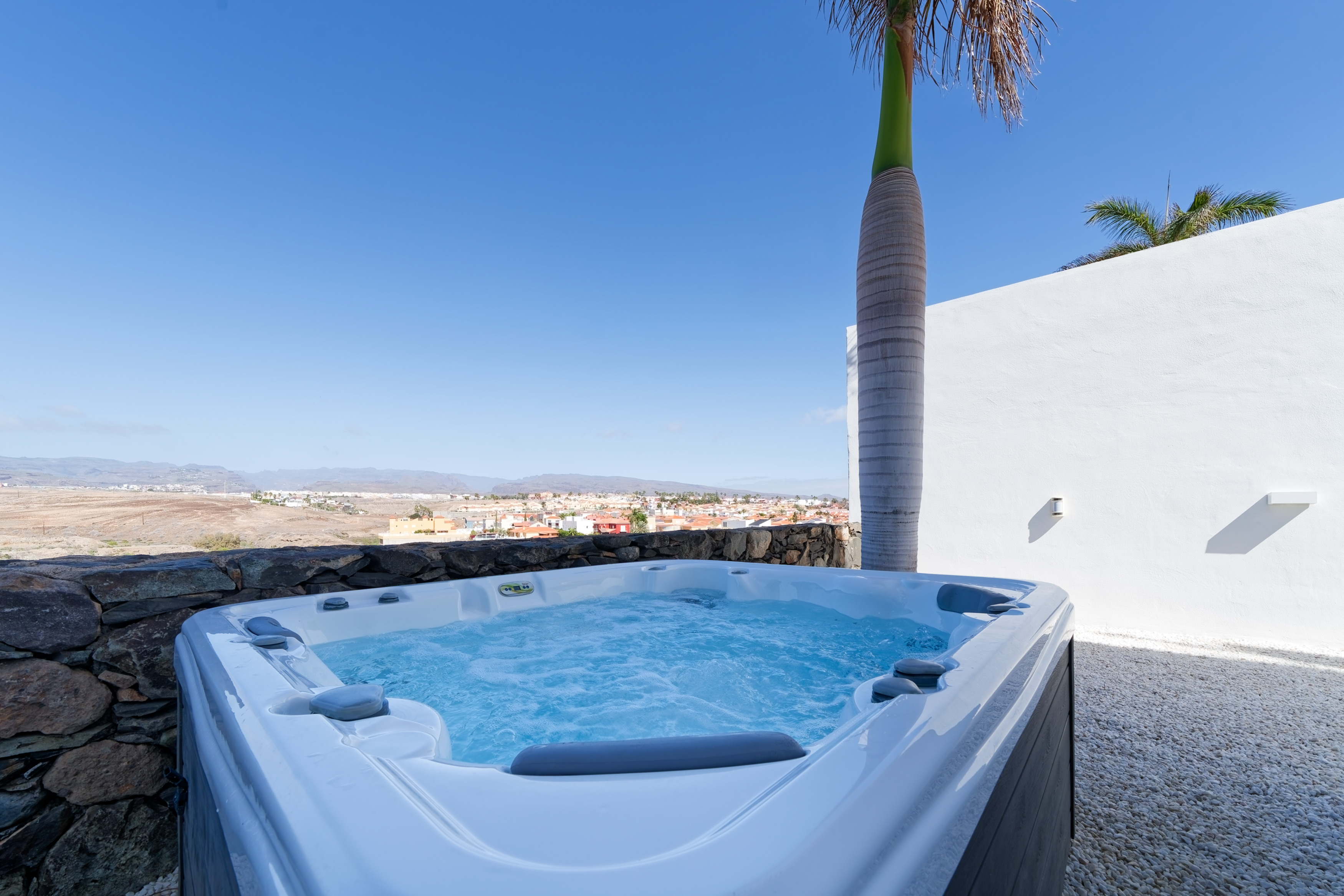 Su zona exterior destaca por la piscina privada, el jacuzzi y una amplia terraza ideal para descansar o disfrutar de comidas al aire libre.
